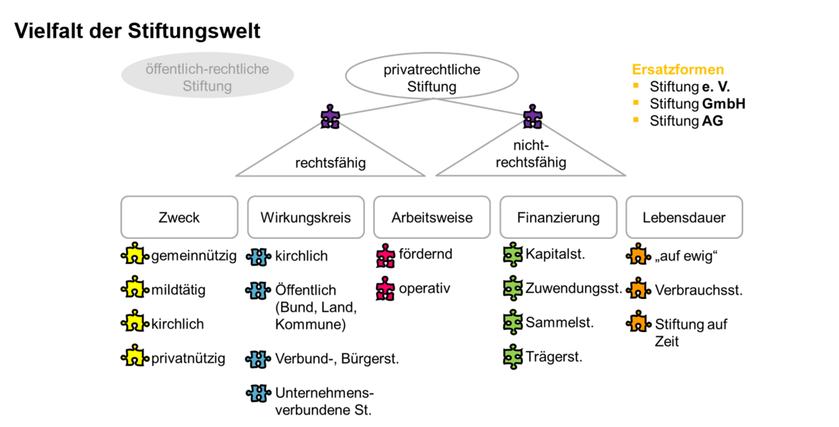 Prototyp der Stiftung ist die rechtsfähige Stiftung des bürgerlichen Rechts, deren Rechtsverhältnisse durch die §§ 80-88 BGB, das am Sitz der Stiftung geltende Landesstiftungsgesetz und ihre eigene Verfassung bestimmt werden. Doch gibt es darüber hinaus eine Vielzahl rechtlicher Gestaltungsformen.