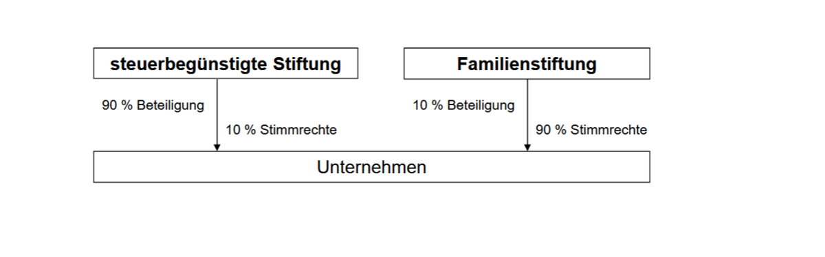 In diesem Beispielsfall hält die steuerbegünstigte Stiftung die Mehrheit der Geschäftsanteile am Unternehmen, während ihre Stimmrechte stark begrenzt sind. Die Familienstiftung hält die restlichen Anteile und übernimmt mit der Mehrheit der Stimmrechte die Rolle der Unternehmensleitung. Auf diese Weise können die Entscheidungsbefugnisse der Unternehmerfamilie und die Kontinuität des Unternehmens gesichert, Steuervorteile genutzt sowie die Familie des Stifters auch finanziell abgesichert werden.